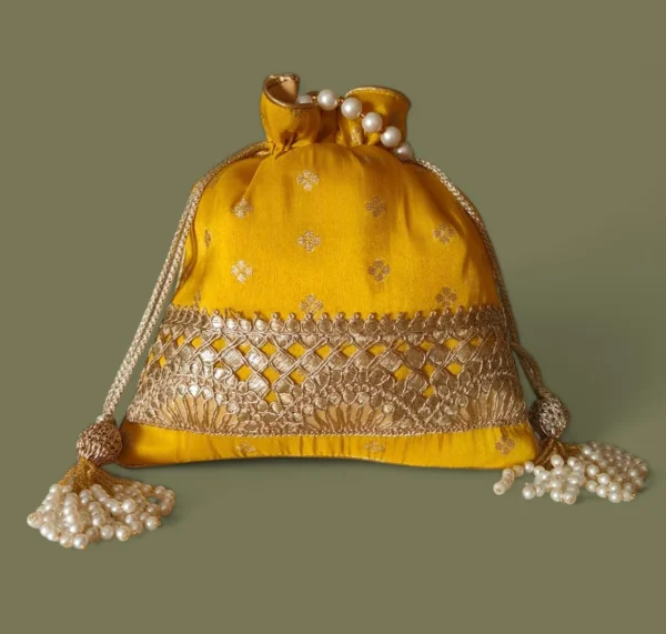 Bright yellow potli bag with subtle motifs and an intricately embroidered zari border, featuring a drawstring closure and pearl tassels—perfect for festive and wedding occasions.