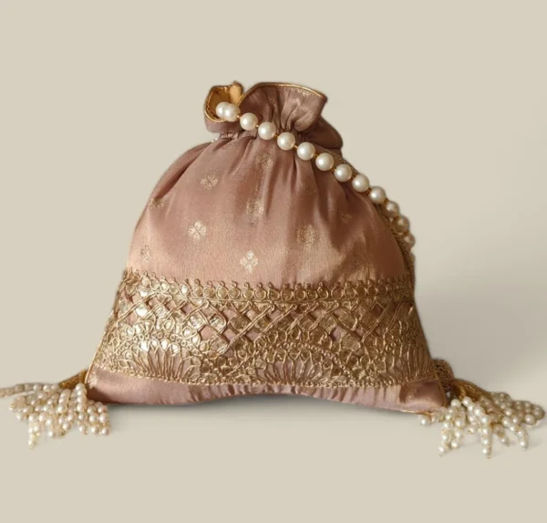 Add a touch of elegance to any outfit with this stunning potli bag in shades of pink and intricate gold lace detailing.