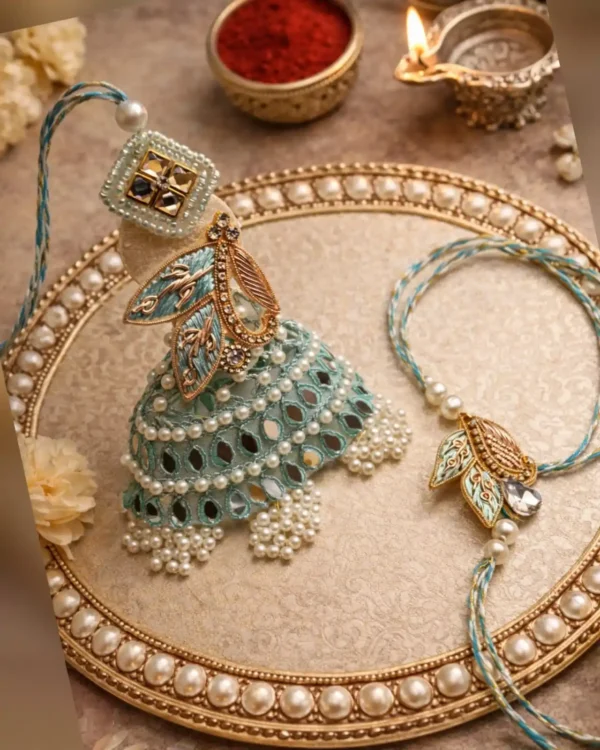 Aqua Blue Designer Rakhi & Lumba Set with Pearl & Bead Tassels