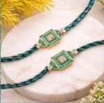 Celebrate the timeless bond of love this Raksha Bandhan with our elegant Green Designer Rakhi. Featuring a beautifully crafted geometric centerpiece adorned with intricate patterns and sparkling stone embellishments, this rakhi blends traditional charm with a modern aesthetic. The rich green tones paired with subtle gold detailing make it a perfect festive accessory.